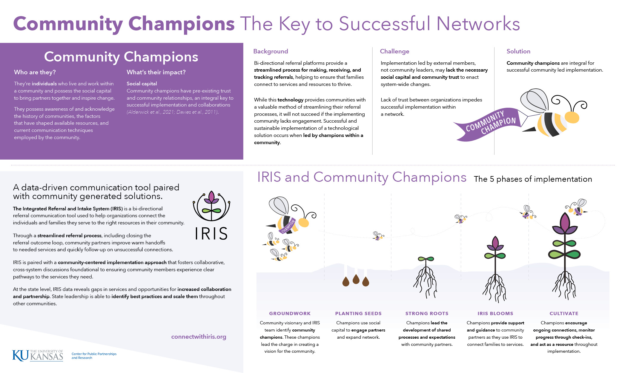 Bi-directional referral platforms provide a streamlined process for making, receiving, and tracking referrals, helping to ensure that families connect to services and resources to thrive. While the technology is valuable, it will not serve its purpose if not adopted by the community. Successful and sustainable implementation requires trust and shared accountability between cross-sector community partners. Implementation administered by outside individuals may lack the necessary trust to create worthwhile change. Through evidence and experience implementing the referral platform IRIS, we see successful and sustainable networks developed when led by champions within a community. Community Champions live and work within a community and possess the social capital to bring partners together and inspire change. These Champions acknowledge the history of factors that have shaped available resources, how providers currently engage with each other, and how families access services. Community Champions cast a vision that resonates with providers across many sectors, including healthcare, education, and early childhood.
