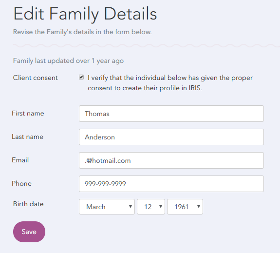 Editing a Family Profile How to Edit a Family Profile1. Select All Families from the Navigation Menu. 2. In the Search Families box, type in a first and/or last name. 3. Click Search.4. Click the name of the family profile you want to edit.5. Click Edit Family. 6. Make the desired edits and click Save to save changes.