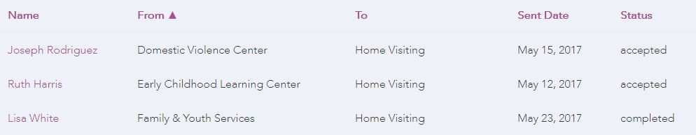 The All Referrals grid displays information specific to an individual referral including: the referred family, the two organizations involved, date sent, and referral status. You can search for a referral using the Search feature or sort families using the All Referrals grid. The All Referrals categories can be sorted in ascending or descending order by clicking on the category title (Name, From, To, Sent Date, and Status).