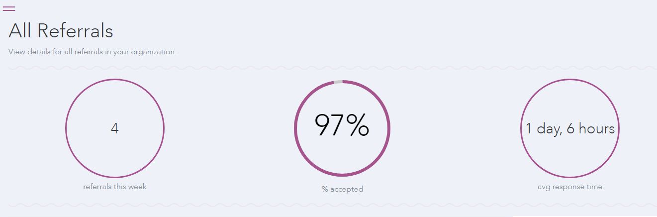 All Referrals allows users to easily access referral data for their organization. You can filter the data by caregiver name, by organization, referral status, and by date range. Data is displayed through the All Referrals grid and can be downloaded as Excel spreadsheets. The data visualization shows the number of referrals made, the percentage that have been accepted, and the average response time, based on the search results.