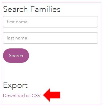 - Click Download as CSV under Export in the Search Families Box. An Excel spreadsheet titled 'client-list' will download to your computer's Downloads folder.