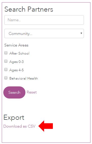 - Click Download as CSV under Export in the Search Partner Organizations box. An Excel Spreadsheet titled "organization-list" will download to your computer's Downloads folder.