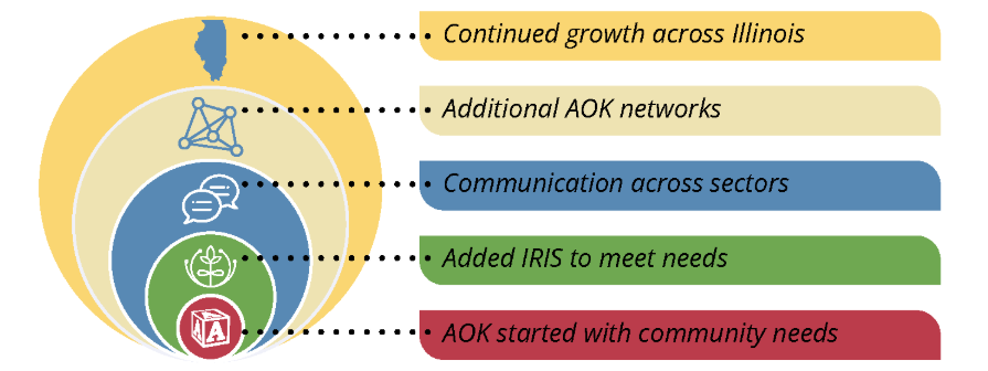 The diversity of the AOK Networks spans from multi-county regions to neighborhoods in the City of Chicago. AOK Networks will continue their support of local systems improvement efforts to transform the family experience through the implementation of IRIS. Providing state and local level entities access to data, streamlining referrals through connection and collaboration, and connecting families and children with services AOK Networks create a more holistic approach for all families and children to thrive.