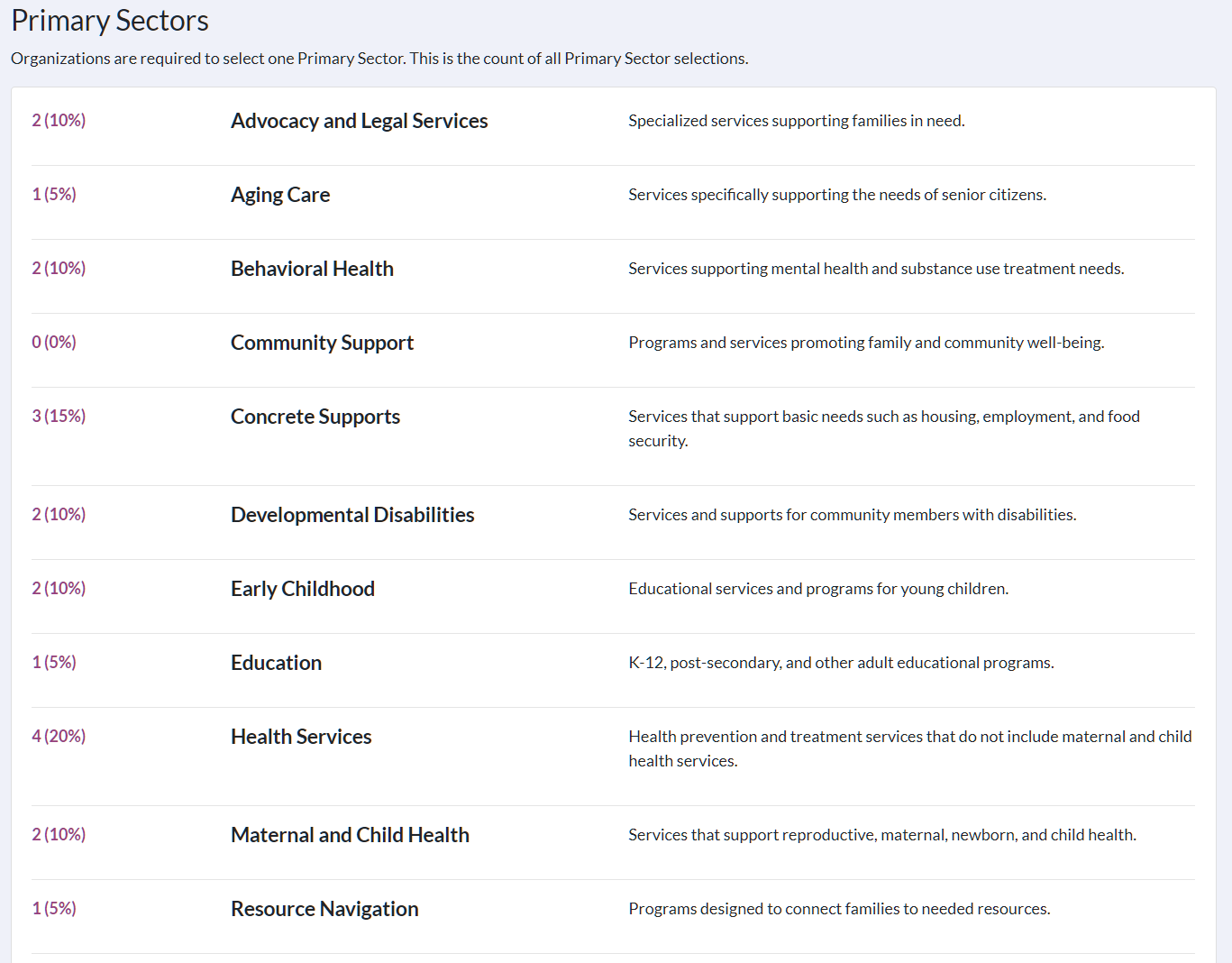 Similar to the previous section, the All Sectors section lists each sector, its definition, and the selected count. However, this section provides a count of the Primary and Secondary Sector selections for each active organization in the community.