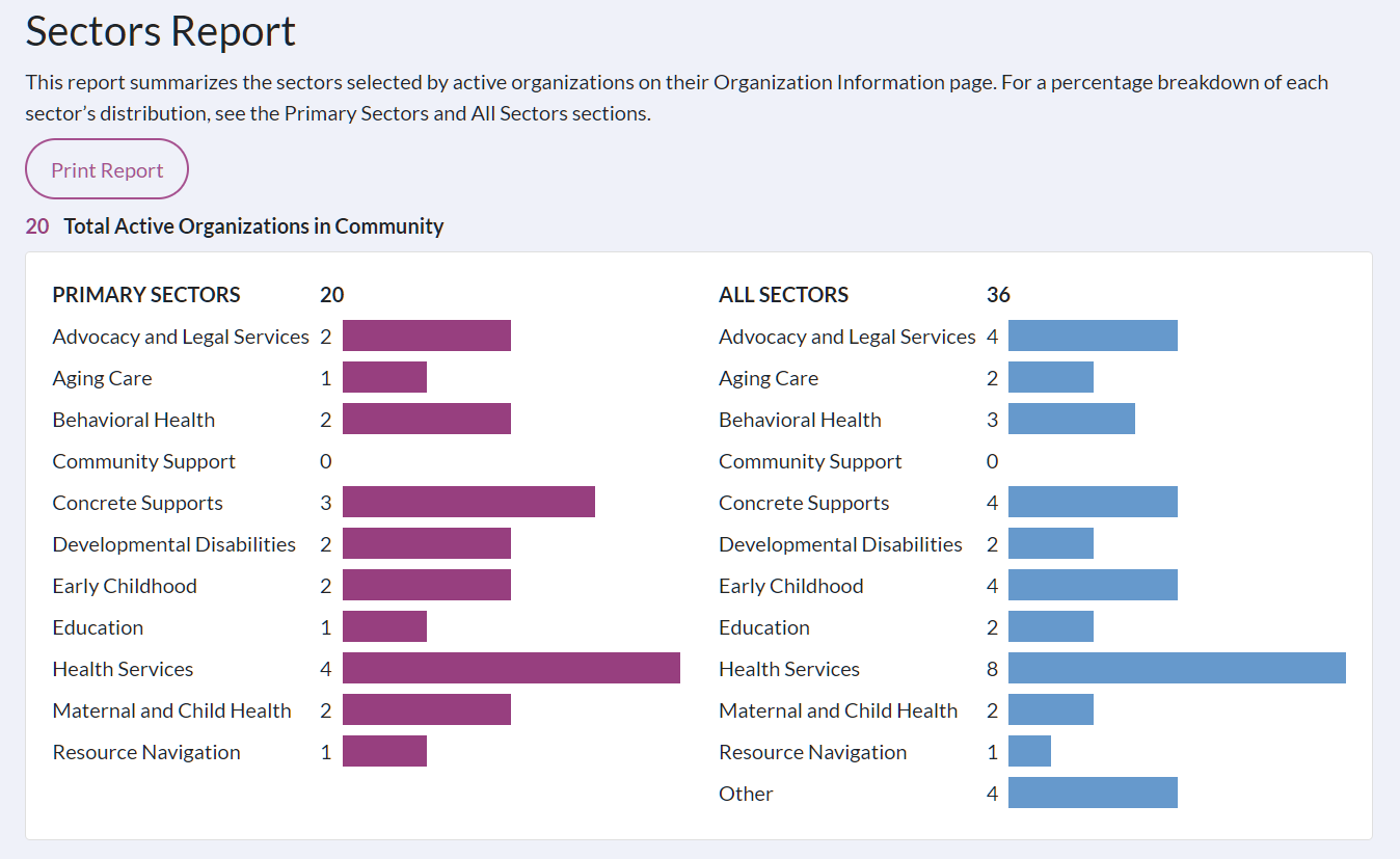 The Sectors report summarizes the sectors selected by active organizations on their Organization Information page. It has three parts: a summary bar graph, the Primary Sectors section, and the All Sectors section. The Primary Sectors and All Sectors sections provide a percentage breakdown of each sector’s distribution.
