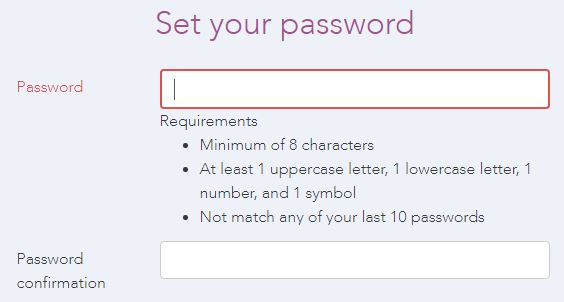 - Enter your new password and then enter it again under Password confirmation. Note: Passwords must meet the following requirements: