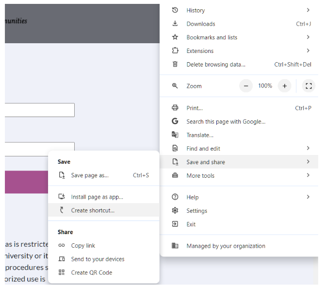 - Select "Save and Share" from the menu and then "Create shortcut."