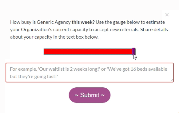 - Move the purple slider to the level of capacity that best meets the organization’s current capacity status. The colors of the bar range from green, indicating high availability, to red, which signals no availability.